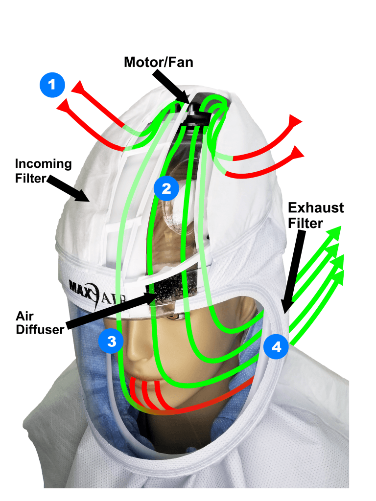 Outside toxic air is drawn in under the Filter Cover Cap (FCC) and through the PAPR100-N Filter, removing airborne contaminants with 99.99% efficiency.